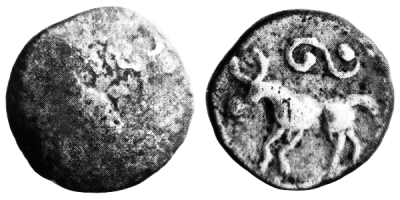 Rv popis: stojící býk doleva mohutné tělo, nad ním stočený had (?) v podobě ležícího zrcadlově otočeného S