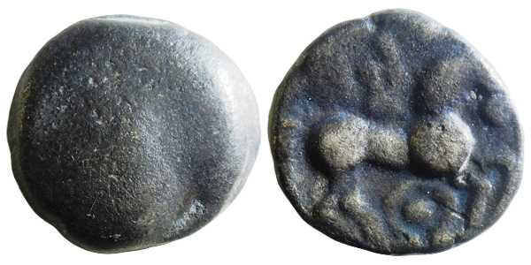 Rv. popis: stylizovaná kůň doprava, tělo tvořené dvojicí kuliček spojené širokým podlouhlým hrbolem, krk zobrazen mírně stočeným obloukem doprava, hlava skloněná dolů zakončená kuličkou, ocas směřující mírně nahoru, poté stočený kolmo dolů, zadní nohy mírně pokrčené, přední nohy mírně pozvednuté, nad koněm dvě svislé mírně doleva nakloněné čáry, čára vlevo kratší, pod koněm samostatný omegovitý symbol s kuličkou uprostřed